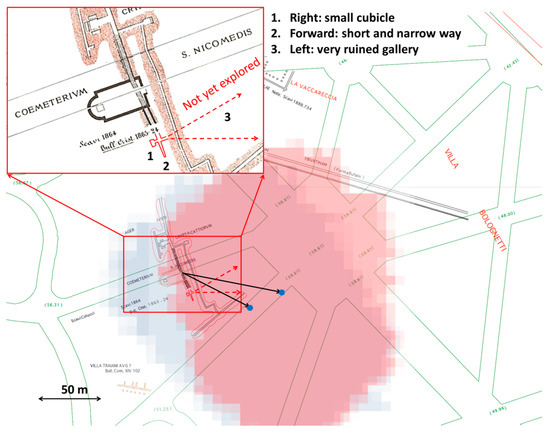 The question now is: What have the archeologists found in the area where the alleged Peter hit the stick on the ground? It is worth noting that the blue area falls on the so-called Anonymous Hypogeum of Via dei Villini (point 2 in Figure 7), a map that is explicitly reported by Lanciani in his Forma Urbis Romae [54]. The line-of-sight between the center of the blue region and the entrance of the hypogeum is about only 20 m. In the next section, we discuss the obtained results, grounding them on the archeological knowledge concerning the catacombs discovered in the area where Peter’s first alleged burial site has been located.