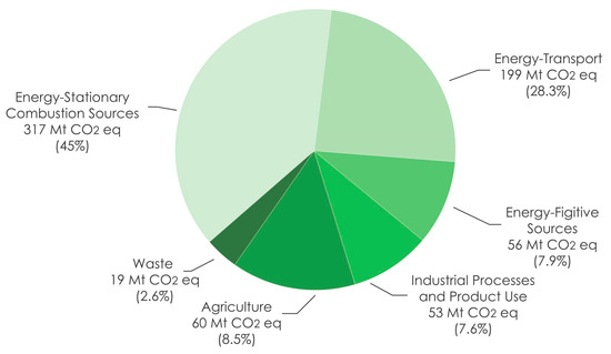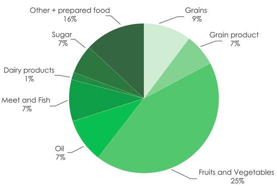 When considering food, the current life cycle of agricultural products consists of seven stages: food production, distribution and aggregation, processing, marketing, purchasing, preparation and consumption, and resource and waste recovery. Nearly 60 Mt CO2 eq (8.5%) out of a total of 704 Mt CO2 eq (100%) are emissions caused by agricultural processes, while 199 Mt CO2 eq (28.3%) falls on energy consumption and transportation, which is a critical stage of the entire food chain [3] (Figure 1). Besides energy and water expenditure, waste generation used for packaging is dramatic and directly harms the environment. According to Kissinger (2012), for example, 30% of all agricultural and food products consumed in Canada are imported from other countries and continents, which results in “food miles” of more than 61 billion tonnes km [4].