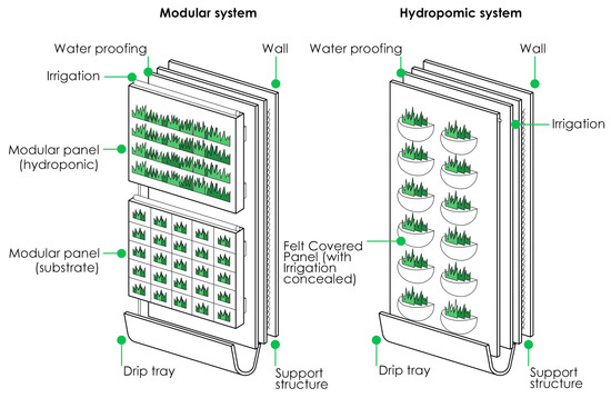 Living walls can be characterized into hydroponic and soil-cell systems (Figure 4) [12]. Hydroponic systems usually use a dense mat and felt components as growing media [12]. This hydroponic system is lightweight and saturated with nutrients, where roots grow on and between layers of the chosen substrate [12]. Hydroponic ILW systems can be modular or composed of big panels fixed via brackets. On the other hand, soil-cell systems are subdivided into individual compartments and grouped together in panels to attach to the frame and control the growth of plants [12].