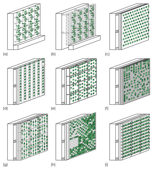 Diversity of living wall typologies [26]. (a) Indirect green facade with a two-dimensional trellis, (b) indirect green facade with a three-dimensional trellis, (c) vegetated mat living wall system, (d) hanging pocket living wall system, (e) framed box modular living wall system, (f) wire cage modular living wall system, (g) perforated box modular living wall system, (h) slanted cell box modular living wall system, and (i) through planters.