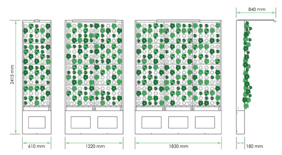 The Versa Wall (Figure 6) represents a self-contained automated system, which guarantees efficient water management and the prevention of soil or water spills. The trays of the Versa Wall system are designed to optimize water consumption through the recirculation of water through the plants and the automated pipes that allow its further reuse [27]. In this case, the Versa Wall is good for people who lack free time or are unable to manage watering and irrigation by hand.