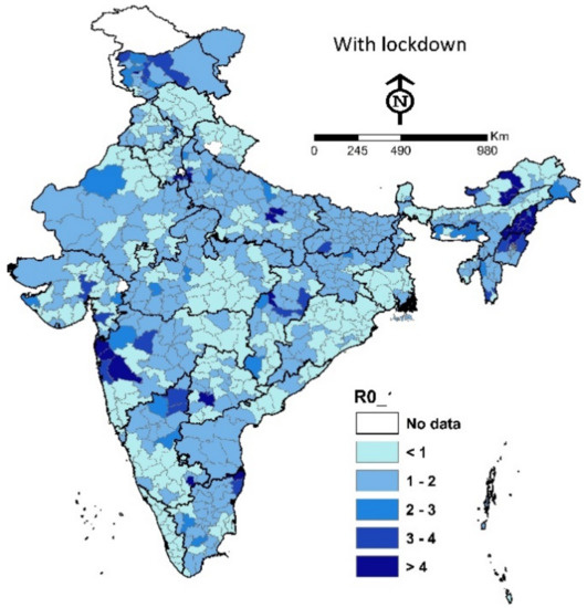 - District-wise spatial distribution maps illustrating reproduction rates with and without lockdown measures are prepared with the help of ArcGIS 10.2.