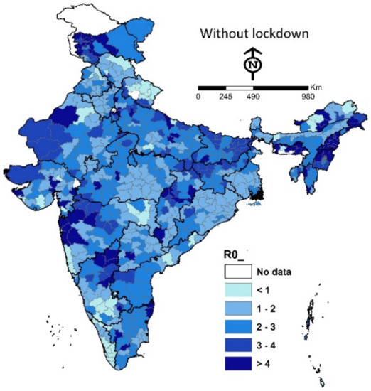 Figure 1 and Figure 2 present the spatial distribution of reproduction rate in Indian districts with and without lockdown respectively. It is found that the has increased significantly without lockdown measures in almost all the districts of India. In the majority of the districts, its values are greater than 2, which shows the critical condition of the spread of COVID-19 infection in several regions of India.