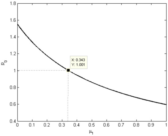 Change in the basic reproduction number with respect to the parameters, contact rate , recovery rate , mortality rate of the COVID-19 , and regional intensity of the COVID-19 is plotted in Figure 3, Figure 4, Figure 5 and Figure 6 respectively. In Figure 3, it is observed that in a complete lockdown situation (), is less than 1.4. As we know, there is an exponential rise in the number of infection cases with time when exceeds 1. During this COVID-19 outbreak, is consistently estimated as greater than 2 in most of regions in India. Figure 6 shows that the strict lockdown curfew in India can reduce the by up to 1.12. The intensity of infection in India is high enough that even lockdown is not enough to control the spread of the COVID-19 virus. Figure 3, Figure 4, and Figure 6 explain that the is less than one when the contact rate is less than 0.20, or the recovery rate is more than 0.94, or the mortality rate of COVID-19 greater than 0.34.