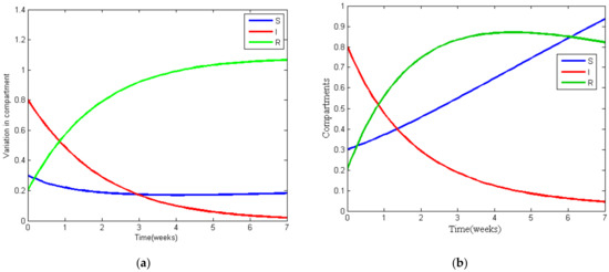 Figure 7a,b shows the variation in each compartment of the model with time w.r.t COVID-19 cases in the world and India respectively. The values of the parameters for Figure 7a are , , , , , and ; the values of the parameters for Figure 7b are , , , , , and . The initialization of susceptible, infected, and recovered compartments is given by , , and respectively. Evaluation of recovery rates of COVID-19 in the world and India indicate that the recovery rate in India is high.