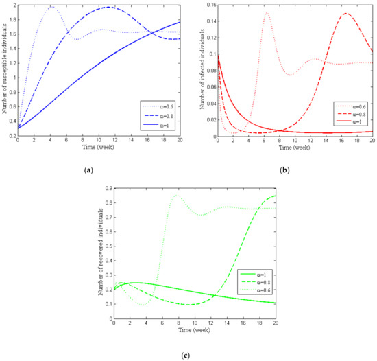 (a) Variation in susceptible class with change in , (b) Variation in infected class with change in , (c) Variation in recovered class with change in .