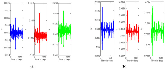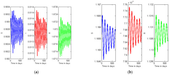 Figure 9a,b displays oscillations in the susceptible, infected, and recovered compartments due to the COVID-19 outbreak in the world; Figure 10a,b also displays the oscillations in the compartments due to the outbreak in India. Figure 9a and Figure 10a describe the without lockdown situation (); and Figure 9b and Figure 10b describe with the situation with lockdown (). It can be observed that the oscillations in Figure 9a (Figure 10a) are denser than the oscillations in Figure 9b (Figure 10a); it expresses that the intensity of the outbreak is higher without a lockdown situation.