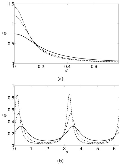(a) The radially averaged probability distribution for elongational flow for with and , denoted by the solid, dashed, and dot-dashed lines, respectively, in the upper quadrant . (b) The radially averaged distribution under shear flow, with .