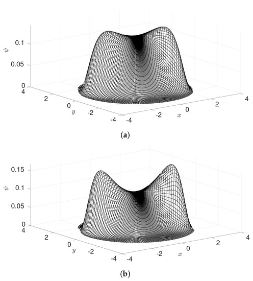 Equation (31) does not account for the following two constraints. Firstly, that , and second, upon scaling of , the condition of which introduces nonlinearity in . To approach these conditions a fixed point finite element iterative scheme is used to reach a default tolerance: