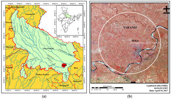 (a) Location map of Varanasi city, India (study area). (b) White circle shows Varanasi city marked on Landsat 8. image.