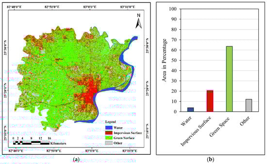 (a) Land-use–land-cover (LULC)-classified map of Varanasi city. (b) Percentage-area-based division of the four LULC categories.