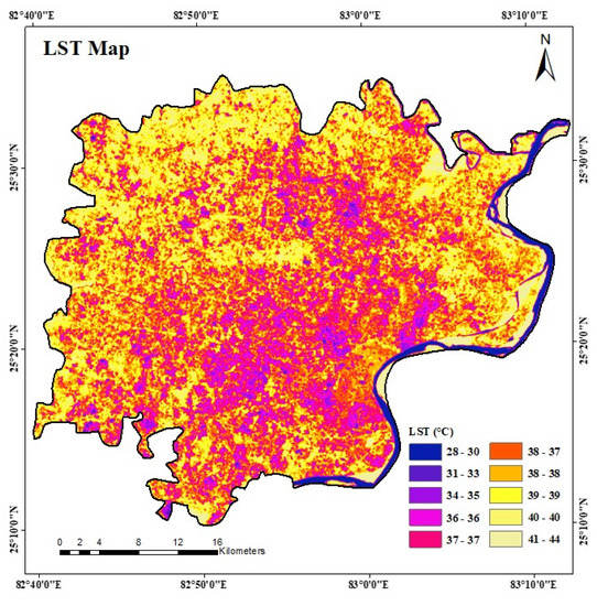 The land surface temperature (LST) map for Varanasi city is shown in Figure 3. The LST values for the region range from about 28 °C for water surfaces to 44 °C for impervious cover with a mean and standard deviation of 38.2 °C and 11.4 °C, respectively. The difference between average LST over impervious cover (39 °C) and green cover (37.8 °C) was observed to be 1.2 °C. This implies that land-cover change influences land surface temperature. These findings highlight the potential of classified urban cover based on training classes (LULC categories) and indices using RS data (LST) and are consistent with the results in connection to the SUHI effect in Bangkok, Jakarta, and Manila cities of Southeast Asia [15].