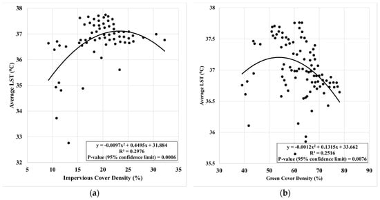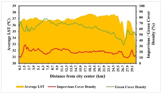 Both the impervious cover and average LST values were observed to gradually decrease along the urban–rural gradient (i.e., gradual decrease from urban towards rural area), whereas green-cover density showed a contrasting pattern. However, the relationship between the density of green cover and average LST was comparatively weaker compared to the impervious-cover densities and average LST (Figure 4). For a range of 10% to 20% of impervious-cover density, average LST ranged from 32 °C to 37 °C, while for areas having an impervious-cover-density range of 20% to 40%, the variation in average LST was low ranging from 36 °C to 38 °C. With the increase in green-cover density, a decline in average LST was observed. Figure 4 shows that for impervious cover, small changes in cover density have a comparatively greater impact on average LST than for green cover.