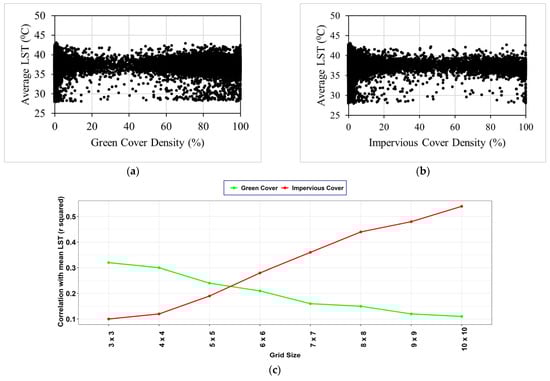 Figure 6a,b shows the results of correlation coefficients between impervious-cover density, green-cover density, and average LST for various grid sizes. An increasing trend was observed in the correlation between impervious-cover density and average LST with an increasing size of grids. This increasing trend shows that large areas strongly influence the impervious cover on the average LST values. The results are coherent with a few other works available using a similar approach [15,51,52,53,54].