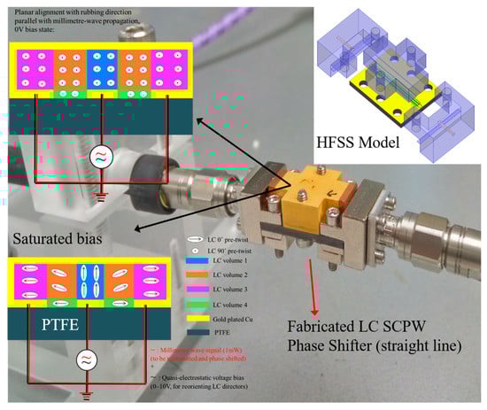 To investigate this knowledge gap, this work intends to quantify the tunable LC materials’ FoM (ratio of materials’ tunability to maximum dissipation factor) and the device’s FoM (ratio of differential phase shift to the maximum insertion loss) based on both numerical and experimental analysis performed on a state-of-the-art shielded coplanar waveguide (SCPW) []. The SCPW phase shifter is fabricated with nickel-free gold plating of an optimum thickness [] (Figure 1) and edge-mounted with V connectors (1.85 mm). To probe the underlying behaviours, simulation is performed using an Ansys High-frequency Structure Simulator (HFSS, see top right of Figure 1) based on a bespoke mixed-signal quasi-analytical model (see the schematic view at the bottom left of Figure 1) that allows affordable yet reasonably reliable computation with a dielectric partitioning scheme [] for local polarisation and tunability analysis of LC molecules interfacing the guided mmWave signals. Geometry details of Figure 1 are provided in the following section.