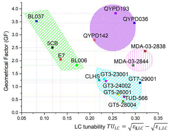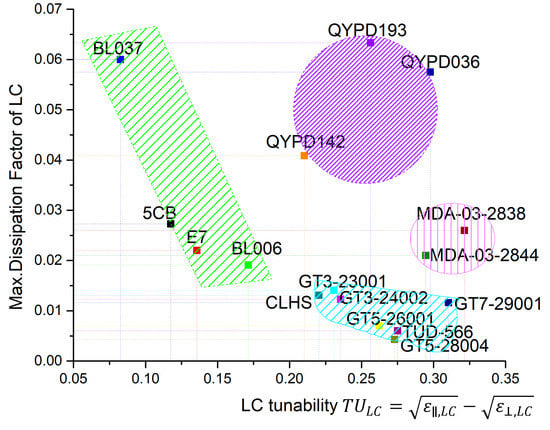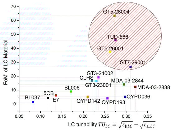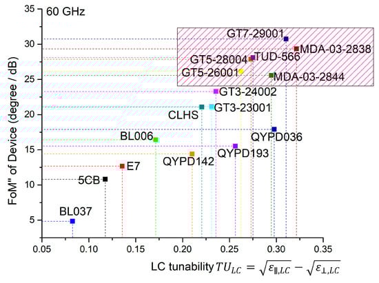 Various LC materials’ FoM′ at 60 GHz (results derived from Figure 2).