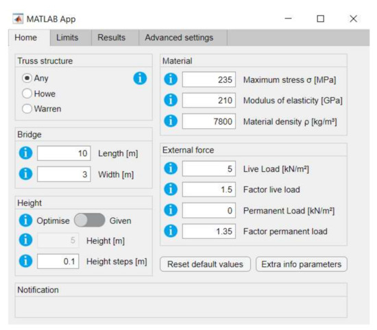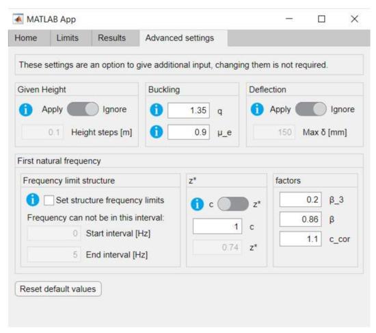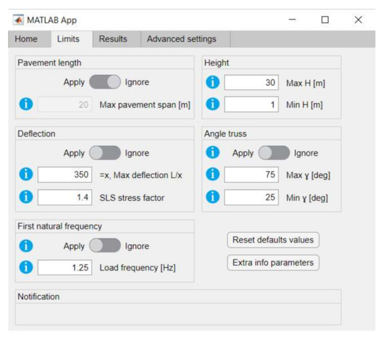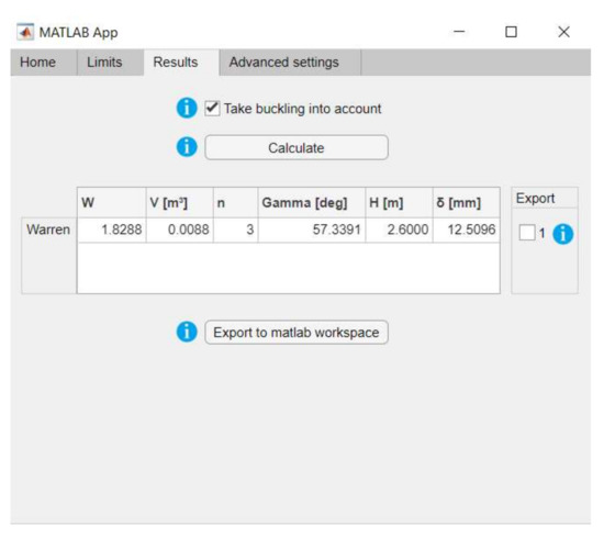 The design tool is divided into four sections: Home, Limits, Results and Advanced settings, as shown in Figure 1, Figure 2, Figure 3 and Figure 4. Home is where the type of truss, the dimensions of the bridge, the material specifications and the loads acting upon the bridge can be defined. Limits is where the user can specify the constraints. The adjustable constraints are the pavement length, height, deflection and first natural frequency. Results is where the user determines if buckling needs to be considered, and where the result is calculated. The final tab, Advanced settings, is where the user is able to change parameters that in most cases would be a standard fixed value or to give certain values in a different form (e.g., displacement in mm instead of L/x). This prevents that the critical path to get a result, is cluttered with input options.