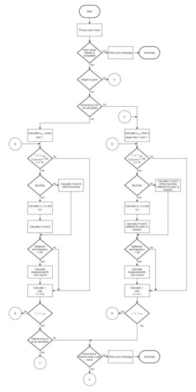 The result consists of six parameters: the volume indicator W, the volume V in cubic meters (derived from W), the number of panels n, the angle g that the first diagonal makes with the lower horizontal chord, the height H and the deflection d in millimetres. If the height is fixed there can be up to three results: the first is the optimal layout for the given height; the second is the absolute optimum with the optimal height; the third is the layout where the height is minimal but where the volume indicator is equal to or lower than that for the given height. If the optimal height is to be determined there will only be a single solution, the absolute optimum for the given span. The essential steps that the software runs through to calculate the result is depicted as a flowchart in Figure 5 and Figure 6.