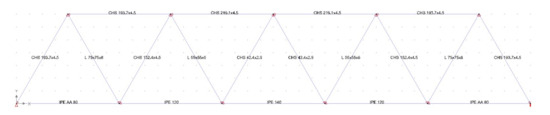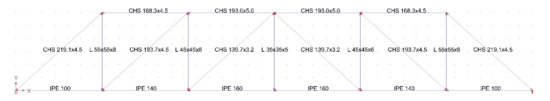 The aim is not to obtain the same volume as indicated in the developed design tool. Rather, the structural calculations in Diamonds serve as confirmation of the indicated most optimal structure according to the design tool. The results are shown in Table 1 and Table 2. When reviewing the results, it can be concluded that both Diamonds and the design tool follow the same trend, independent of the span-to-height ratio. The most optimal result according to the software tool is indicated in bold, the results in Diamonds that deviate are highlighted in yellow. There are some important remarks to be made. The morphological indicators do not consider actual cross sections for the different bars in the truss. They consider a form factor which is equal for all bars, and which expresses the efficiency of the cross section. In the software tool, a highly efficient cross section is assumed. One can understand that in a truss, where the internal forces are all normal forces, this form factor is only important for bars in compression, thus bars susceptible to buckling. Additionally, regardless of the bars’ susceptibility to buckling, the morphological indicators assume that all bars are dimensioned so that they are all fully stressed, 100%. When this was translated to a realistic structure in Diamonds, only standard profile sections were used, corresponding to the considered form factor. Thus, for all bars in compression, profiles of type CHS with standard dimensions available in the European Union and the United Kingdom were chosen. The diagonals in tension were appointed L-shaped sections, because these are available in very small sizes and can thus approximate a fully stressed state. For the bars in the lower beam of the truss, it was chosen to use standard I-shaped sections, because the lower bars are also very susceptible to bending considering their self-weight. Some examples are shown in Figure 7 and Figure 8.