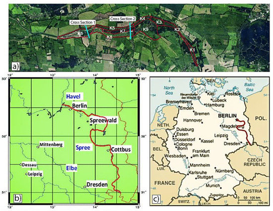 (a) Satellite image of the study area, (b) Channel across the major geographic locations, and (c) river location in Germany are illustrated in the figure.