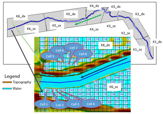 Appropriate grid dimensions and computational time step are very important to assess flooding in 2D areas. The hydraulic modeling systems are powerful systems to choose spatial and time variables to the desired degree of accuracy (HEC-RAS manual) [44,45,46]. In this study, different computational time steps and grid sizes were analyzed to assess the flooding situation in the project area (Figure 3). The total project area was divided into six sub-floodplains (sub-reach), and a set of eight cells was selected to represent the response in the water depth due to the variation in time steps and grid size.