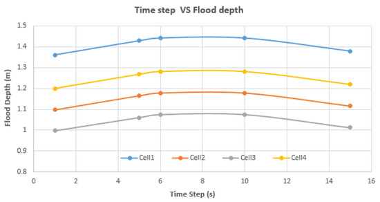 The relation between time step and flood depth at four indicated cells (Cells 1–4) in the floodplain.