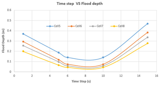 Change in the maximum flood depth value (Cells 5–8) for different time steps in sub-reach K6.