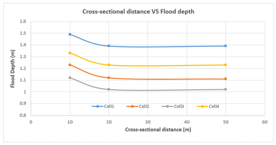 Change in the maximum flood depth value (Cells 1–4) for different cross-sectional distances in sub-reach K6.
