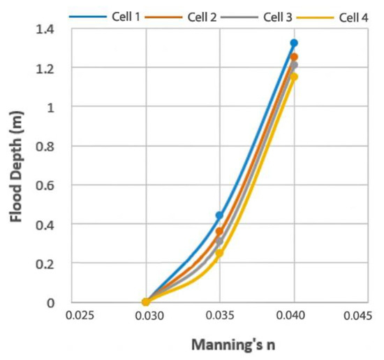 Change in the maximum flood depth (Cells 1–4) value for different Manning’s n in sub-reach K6.