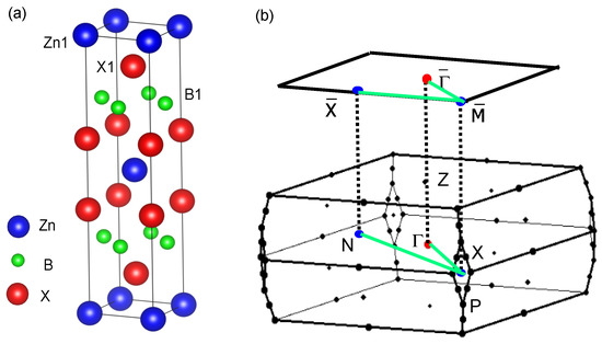 The BZn structure is shown in Figure 1 by denoting Zn, B, and X in blue-, green-, and red-colored spheres, respectively. The arrangement of atoms for the Zn1, X1, and B1 layers is labeled as top–down views. The first BZ of the structure is shown in Figure 1b with the high symmetric points and the (0, 0, 0) point located at the center. The (001) surface BZ is shown in labeling with , , and including surface BZ at the center.