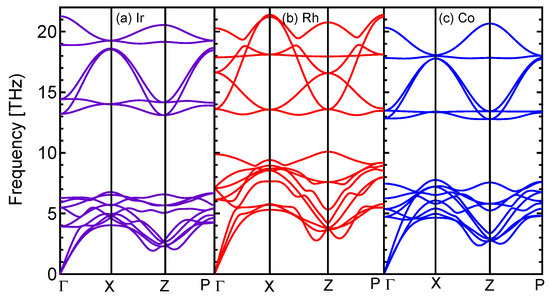 During the total energy calculation of B, X, and Zn, we use optimized structures of trigonal crystal of space group 166 (Rm) for B, a cubic crystal of space group 225 (Fmm) for X, and hexagonal crystal of space group 194 (/mmc) for Zn. By using Equation (1) we calculate the formation energy for BZn as −0.3005 eV/atom, −0.3245 eV/atom, and −0.2279 eV/atom, for X = Ir, Rh, and Co respectively, the last column of Table 1. Since all three compounds indicate negative formation energies with respect to their elemental phases, we identify these structures are theoretically stable.