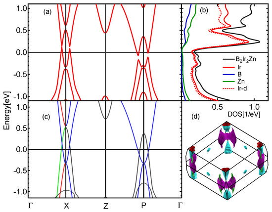 An electronic band structure calculation of BIrZn with GGA with and without the inclusion of the SOC along the high-symmetry k-path -X-Z-P- was plotted by setting the Fermi level at 0 eV on the energy scale as shown in Figure 3. The top panel, (a), shows the band structure of the BIrZn compound with the inclusion of the SOC effect, and the bottom panel, (c), shows the calculated electronic band structure without the inclusion of the SOC effect in irreducible representation. Irreducible representation (symmorphic crystal symmetries) of the band structure shows band symmetries by using different colored solid lines. There were a few bands near the Fermi level. Interesting band features near the Fermi level were noted around X and P points. Since irreducible representation allows us to access each eigenvalue along the chosen k-path, we can identify connecting lines of bands and the symmetries by looking for the same colored bands for the same symmetry [76,77].