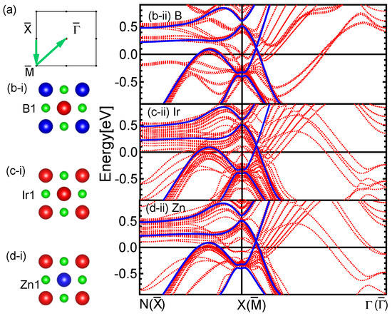 This work is extended to the classification of band structures in a different direction including crystal point group symmetries. Recent studies of topological materials reveal a large class of materials with gapless surface states. Among them, topological insulating states protected by crystal symmetries, rather than time-reversal symmetry, have been introduced as topological crystalline insulators. This motivated us to investigate topological crystalline insulators’ behaviors of the compound. Since the structure is tetragonal as in Figure 1, there is no direct projection of the bulk Brillouin zone to the surface Brillouin zone to observe the surface states in Z-P-. However, we decided to look for the other possible surface Brillouin zones, as in Figure 1c. The projection of N-X- in bulk BZ represents the -- in (001) surface BZ. In Figure 1a, represents the (001) surface BZ. Calculated surface states on the k-path labeled in green are displayed on the right, top-to-bottom by using red solid lines for different termination layers as in (b-i), (c-i), and (d-i) of Figure 4. To study the surface states compared to bulk bands, we plotted the bulk band on top of the surface bands by using blue solid lines. All the calculations were performed for relativistic potentials. We found that all B, Ir, and Zn termination layers show the same features of surface states although they show different band densities. Additionally, we investigated clear surface states on the X-N plane since there is no crossing observed in bulk bands. The surface states on the X- plane were barely recognized due to small gap openings of bulk bands. As is evident, we were unable to project the interested exact bulk Brillouin band k-path in Figure 3 to any surface Brillouin zone path directly. That was the reason to look at the (001) surface plane with the projection of N-X- to see surface states near the Fermi level.