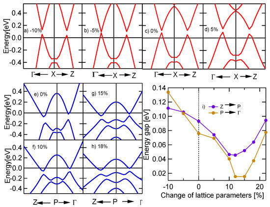 We further studied the BIrZn by investigating the dependence of the band gap on the lattice constants since it can be used as another signature of topological crystalline materials as discussed in the Ref. [43]. We investigated the band gap as a function of the percentage of lattice parameters. The behavior of the two crossings identified as Dirac points on the -X-Z plane in Figure 3 was investigated as shown in the top panel of Figure 5. It displays that there is no manifest effect to change of lattice parameters even by compressing or stretching. We were barely able to identify the gap closing of the X- plane around 5% of lattice compressing, but no effect was identified on the X-Z plane. The behavior of the two crossings identified as Dirac points with band inversion Z-P- path in Figure 3 was investigated as shown in the bottom left panel of Figure 5. It displays that there is a considerable effect on band gap with respect to lattice parameters by stretching. As the lattice parameters increase, the band gap of BIrZn decreases to zero and then re-opens. This gap closing signals a topological crystalline insulator at that ambient pressure which is expected to close 13% of stretching of the lattice. The energy gap as a function of the percentage change of lattice parameters is displayed in Figure 5i by denoting a purple solid color for Z-P and brown solid color for P- paths. Continuously tunable band gaps may lead to wide-ranging applications in thermoelectrics, infrared detection, and tunable electronics.