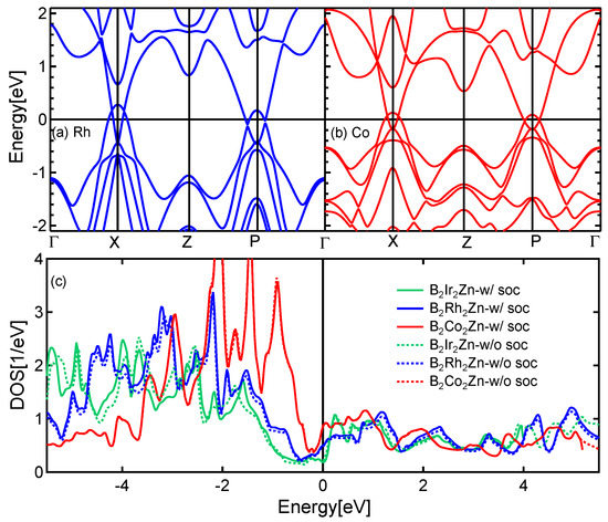 We performed the electronic band structure and DOS calculations for BRhZn and BCoZn by using the same structure as BIrZn. All the calculations were performed by using the optimized lattice parameters from Table 1 and including the SOC effect as shown in (a) and (b) of Figure 6. We conclude that all three compounds display the same band characteristics as discussed above for BIrZn. The energy locations of four crossing points are a little different than the BIrZn. It is also identified that the band structure is more compressed toward the Fermi energy in Co and Rh than Ir. The DOS features around the Fermi level are investigated in three samples with and without the SOC effect, as shown in (c) of Figure 6. We did not identify the manifest SOC effect in DOS by comparing solid and dotted color lines represented with and without relativistic potentials. Figure 6 shows that Co has more DOS near Fermi energy than Rh, and Rh has more DOS than Ir.
