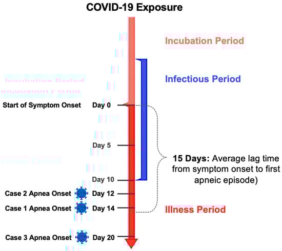 Timeline of events after COVID-19 exposure. Onset of symptoms marked as day 0. Length of infectious period for the average COVID-19 patient is 10 days after onset of symptoms, as per current CDC guidelines. Time from onset of symptoms to first apneic episode was 14 days, 12 days, and 20 days for case 1, case 2, and case 3, respectively.