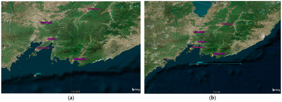 Scenario for the victim receiver station is located at 12 nautical miles from the coastline: (a) aeronautical mobile station at 12 nautical miles from the coastline, and (b) maritime mobile station moves along the border of territorial waters.