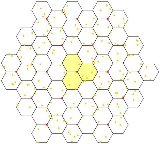 In each city, a 5G NR network was simulated and according to Recommendation ITU-R M.2101 consisted of 19 tri-sector BS with 3 UEs at each sector, and thus interference was calculated from 285 sectors overall. It should be noted that many cities have much more IMT BS; however, they do not operate at the same frequency as AMS receivers simultaneously since the spectrum in this band is divided between the mobile network operators and inside each operator’s deployments to avoid intercell interference, and base stations do not reuse the same spectrum as that in the neighboring cell. Additionally, in many of these areas, operators rely on the other bands as well, and therefore 57 sectors per city is sufficient to estimate the interference level [14]. The typical deployment topology of the 57 sectors networks provided in Figure 2. The red dots represent base stations and the yellow dots represent users.