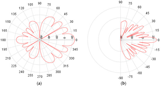 Antenna pattern of 5G NR base station: (a) azimuth plane and (b) elevation plane.