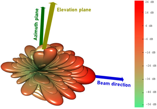 When simulating beamforming, three spatially directive signals were transmitted pointing to each UE within the sector, and the UEs were distributed randomly within the sector, equally distributing the power of each beam between the users [15,16,17]. The beamforming antenna is based on an antenna array and consists of many identical radiating elements located in the yz-plane with a fixed separation distance (e.g., l/2), all elements having identical radiation patterns and “pointing” (having maximum directivity) along the x-axis. Figure 4 presents 3D modeling of the beamforming antenna pattern that was used in the simulations.