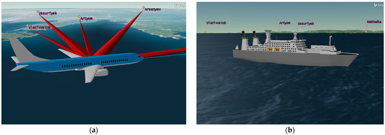 Each simulation consisted of 10,000 events. During the simulations, the aircraft and vessels were placed at a distance of 12 nautical miles (22 km), 80 nautical miles (150 km), and 200 nautical miles (370 km). The 12-nautical-mile distance was considered as the worst-case scenario, whereas 80 and 200 are more likely distances in practice due to the EEZ areas. The 5G NR networks were located in 5 cities in the coastline area—Vladivostok, Artyom, Nakhodka, Ussuriysk, and Arsenyev. Figure 1 shows the scenario of the aeronautical mobile station (AMS) and maritime mobile station (MMS) located at a distance of 12 nautical miles from the coastline.