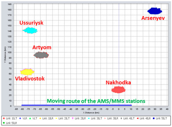 Figure 8 presents a simulation example of the 5G NR networks located in 5 cities for the AMS and MMS stations.