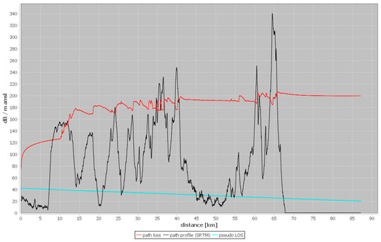 In addition, for both scenarios, terrain data were used for every interfering link, and Figure 9 shows an example of terrain losses from 1 BS located in Ussuriysk to the maritime station. For AMS, no terrain is required since transmission mode from an airborne station to a region before its radio horizon is the line-of-sight mode, and thus the terrain could barely affect the propagation between the 5G station and AMS and therefore was not considered.