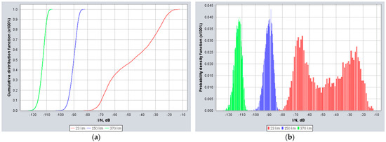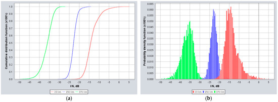 I/N distribution for AMS System 2 with directional antenna: (a) cumulative distribution function of I/N for System 2 AMS receiver and (b) probability distribution function of I/N for System 2 AMS receiver.