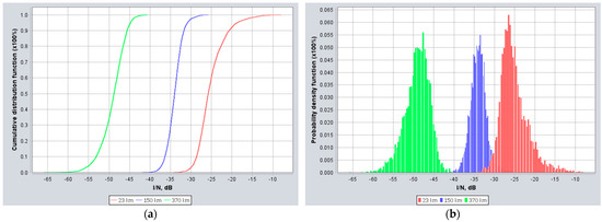 I/N distribution for AMS System 1 with omnidirectional antenna: (a) cumulative distribution function of I/N for System 1 AMS receiver and (b) probability distribution function of I/N for System 1 AMS receiver.