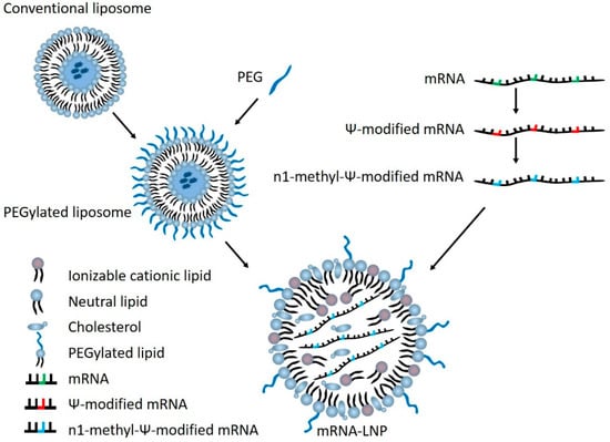 LNP development was improved through two innovations, PEGylation [], and the use of cationic lipids [] (Figure 1). LNP surface modifications by polyethylene glycol (PEG) enable lipid nanoparticles to survive for longer lengths of time [], so that their package contents can be delivered to cells to provoke an immune response when the antigen is expressed []. Another important development for LNPs is the use of cationic lipids, enabling efficient self-assembly and encapsulation of the mRNA []. Cationic lipids can additionally be modified to deliver drugs to certain cell types, an important consideration when delivering mRNA [,].