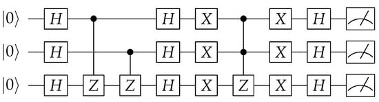 While our paper will not delve into the mechanics of Grover’s algorithm, the circuit can serve as a general example of how quantum circuits operate. There are various ways to implement the quantum circuit for Grover, including the use of different types of gates. In this example, we utilize the implementation proposed in [8], which involves the use of Hadamard and Pauli-Z gates.