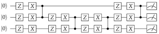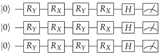 Phalak et al. [9] provide a practical implementation of a quantum PUF, as shown in Figure 2. Readers could also refer to [10] for a theoretical treatment of the topic. Furthermore, Pirnay et al. [11] extend the idea in [9] to have multiple cycles of rotation gates instead of a single cycle, as shown in Figure 3. Following [10], Kumar et al. [12] present an implementation via a regular and entangled configuration utilizing Pauli-X, Pauli-Z, and gates, as shown in Figure 4.