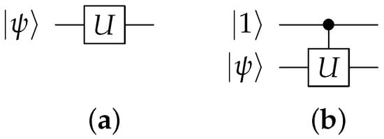 (a) Original gate in quantum circuit, where U is a unitary. (b) A controlled version of the same gate. Control signal determines whether or not the gate is applied.