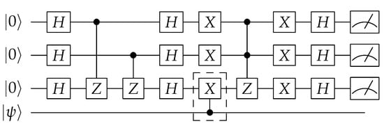 - Grover, L.K. A fast quantum mechanical algorithm for database search. In Proceedings of the 28th Annual ACM Symposium on the Theory of Computing (STOC), Philadelphia, PA, USA, 22–24 May 1996; pp. 212–219. [Google Scholar]
